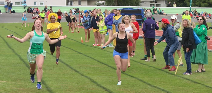 Saphira Waikawa brings the baton home first in the under-15 relay. Photos Peter Jones.