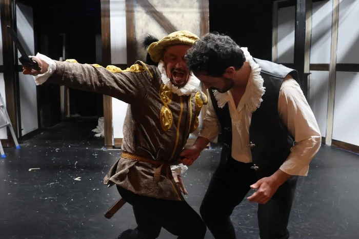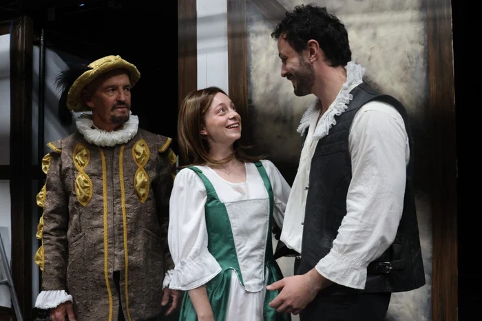 Lord Wessex (played by Rob Miller, centre) comes between Viola De Lesseps (Rose Church) and Will Shakespeare (Anton Peleman) in the Boathouse Theatre’s production of “Shakespeare in Love” opening on 15 April. Photo: Evan Tuchinsky.