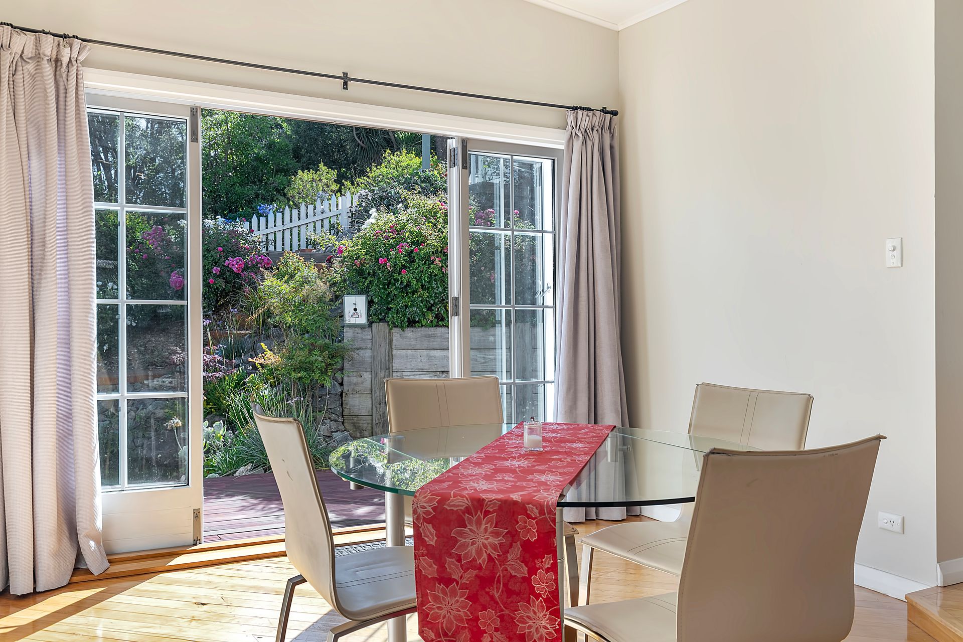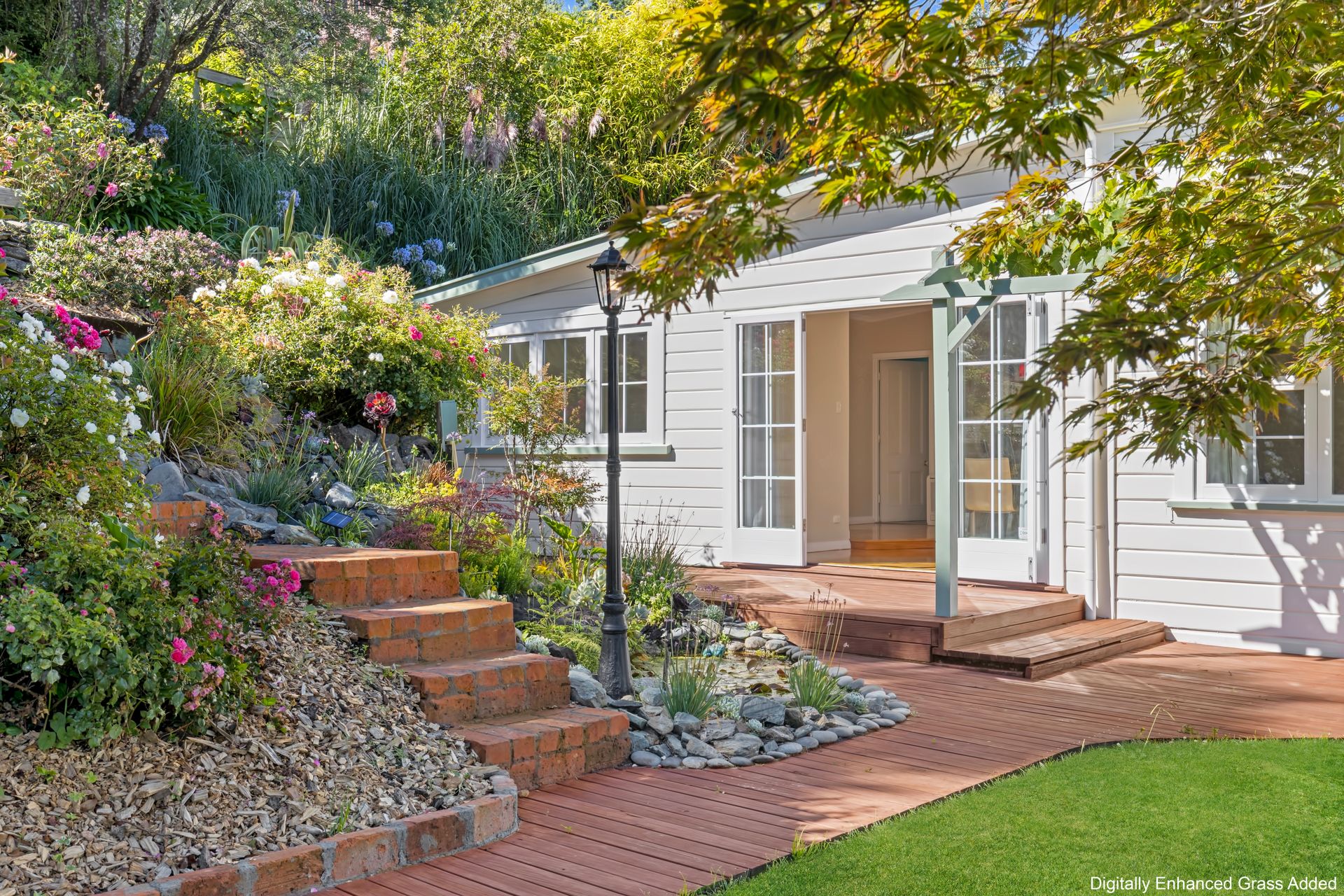 Outdoor living is where this property shines. Multiple decks wrap around the home, offering sun at different times, sheltered spots for long lunches, and front-row views of Picton’s greenery and rooftops. Below, the terraced gardens are a standout – manicured lawns, established plantings, climbing vines and stone retaining walls create a layered landscape perfect for entertaining, gardening, or relaxing.